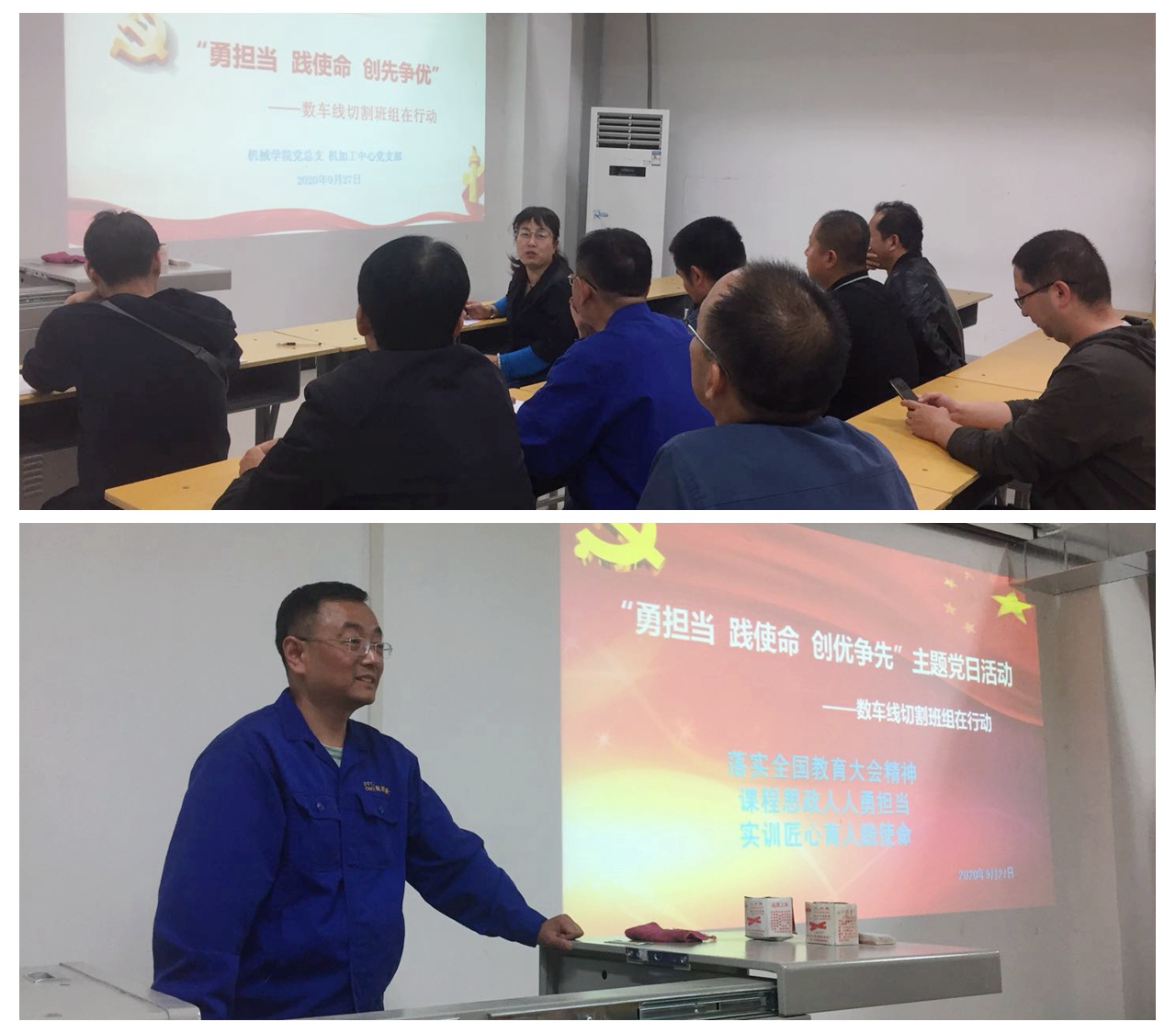 首先,支部书记郭新玲对支部“第三个纪律教育学习宣传月”党纪法规知识学习和考试情况进行了总结,对大家成绩全部在94分以上表示祝贺;传达了9月18日学院第一期“红色教育无初心,锤炼党性担使命”业务培训内容及收获,学习了学院纪委 “关于做好‘国庆’‘中秋’期间纠治‘四风’工作的通知”文件精神。接着数控车及线切割班组2名党员就支部开展“月月有活动,人人可参与,个个能出彩”活动,汇报了班组前期的准备、实施过程以及课程思政等情况,并展示了活动内容和效果。最后大家进行了热烈的讨论,纷纷表示,一名党员就是一面旗帜,要勇担当,践使命,带领机加工中心普通教师,脚踏实际,创先争优,推进支部各项工作上台阶,为专业群建设凝心聚力做贡献。