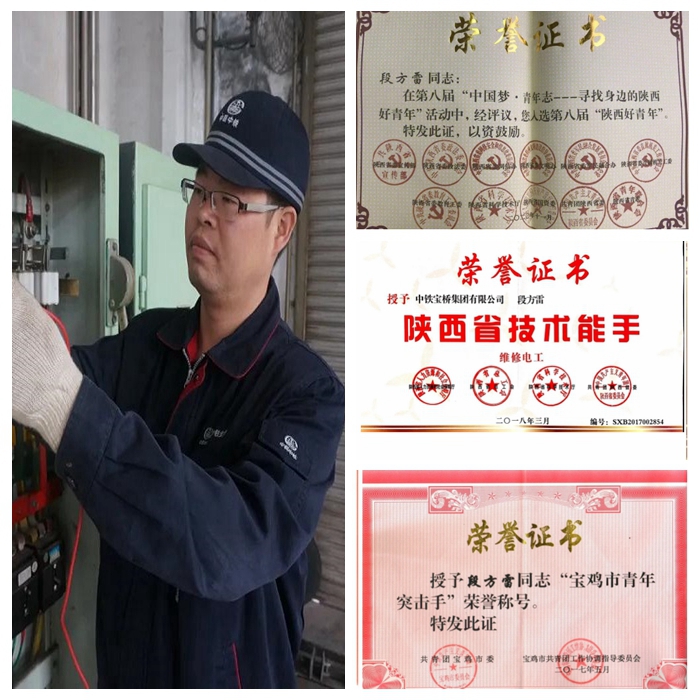 段方雷,男,1986年出生,中共党员,系我院工业自动化技术2004级工电0401班毕业生,目前就职于中铁宝桥集团有限公司,在公司动力车间从事电气维修和安装工作,兼任团支部书记。工作期间,段方雷同志恪尽职守,兢兢业业,工作13年,始终坚守在一线,在平时工作中不但注重理论知识的学习,更加注重实际操作能力提升。先后获得公司第二届“金牌职工”称号,集团公司“先进生产者”称号,“中国中铁优秀团干部”称号,“中国中铁青年岗位能手”称号,宝鸡市青年突出手、陕西省职业技能大赛维修电工个人第四名与团体第六名,陕西省技术能手等十余项集团公司、省市级称号。
