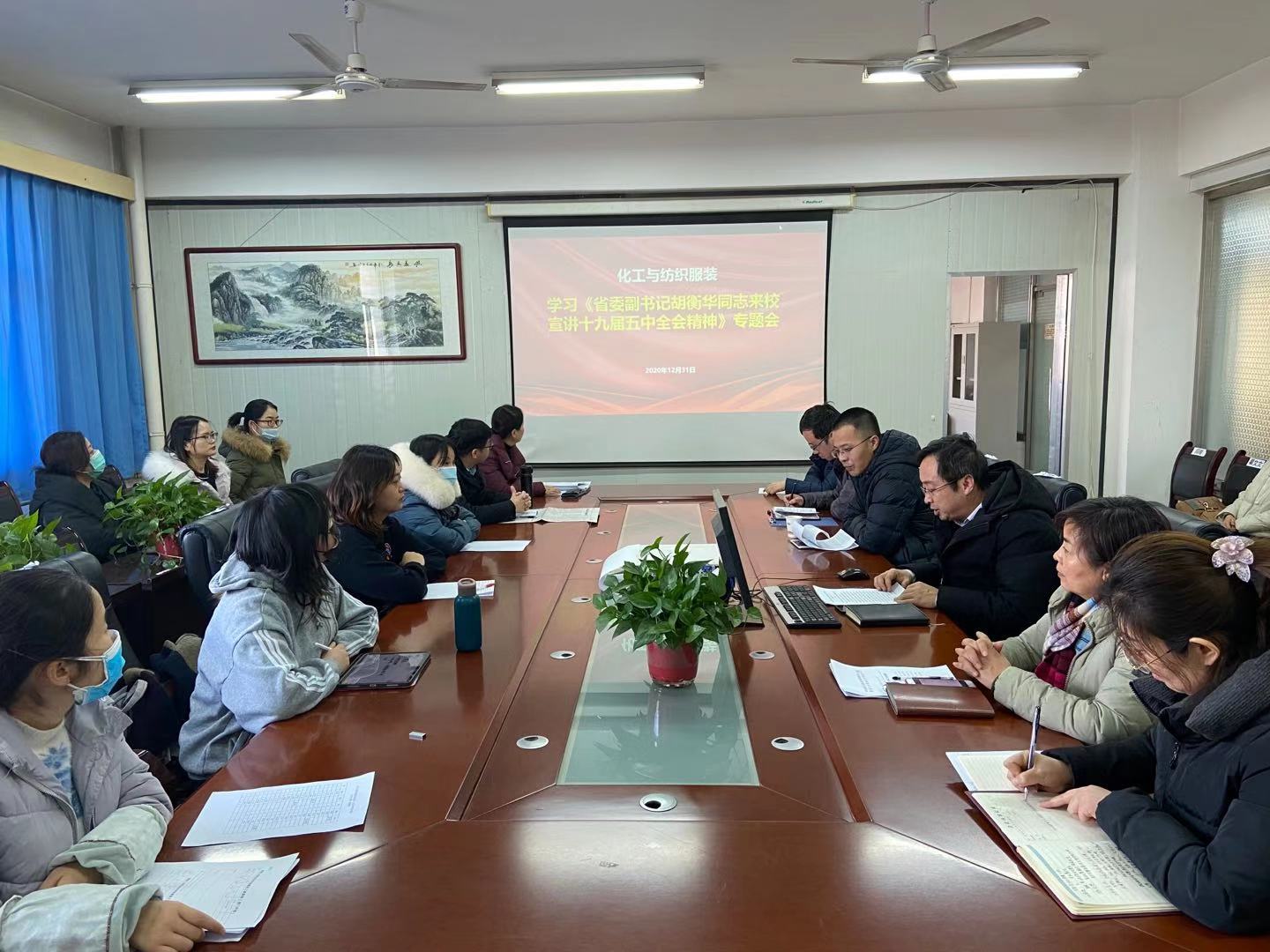 为深入学习领会党的十九届五中全会精神,2020年12月31日下午,化纺服学院召开学习《省委副书记胡衡华同志来校宣讲十九届五中全会精神》专题会,会议由化纺服学院党总支书记王化冰主持,化纺服学院全体教职工参会。