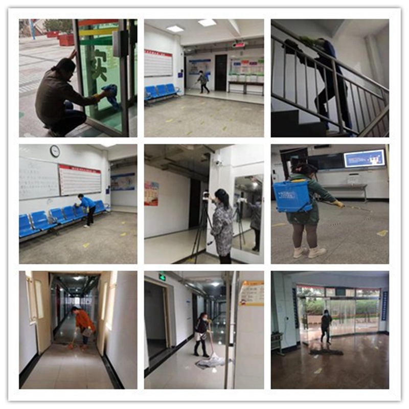 2月25日上午,公寓管理中心全员上岗,按照学校和学生处统一部署及要求,开展全方位的防控工作。为保障学生返校后能够居住在干净、卫生、安全的环境中,公寓工作人员对15栋公寓楼进行彻底的清扫和消毒工作,从地面到门窗,从走廊到扶梯,包括便池都清洁得焕然一新,做到全楼公共卫生无死角。各公寓楼内红外线测温仪已调试摆放完毕,体温计、消毒液、喷壶等各项防疫物资配备及时到位;各公寓楼全楼开窗通风,对楼内进行全方位消毒,真正做到干净、卫生、安全;联系公寓楼内洗衣机、自动售货机的工作人员对设备进行检查、清洗和消毒工作,确保开学后学生能够正常使用。