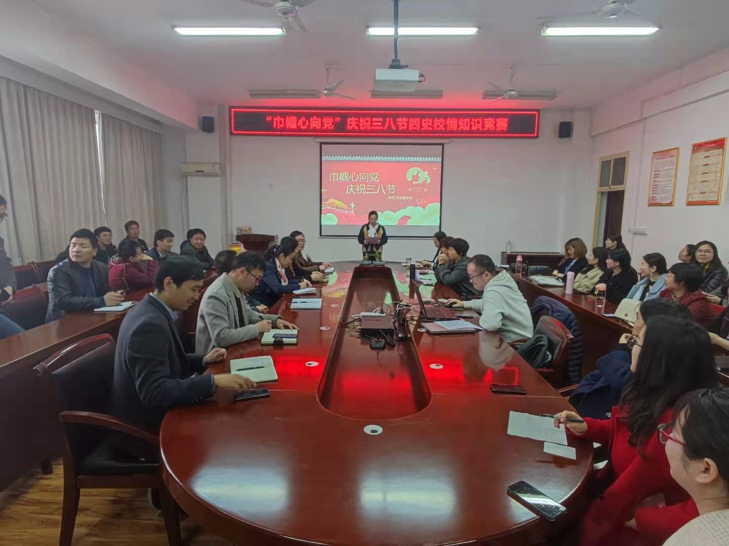 智慧“三八”节。3月4日下午,商贸与流通学院分会“巾帼心向党”四史校情知识竞赛在崇文楼5楼举行,此次知识竞赛以“四史”和“校情”为主要内容,借助微信“摇一摇”功能和学习通平台开展现场必答和抢答。竞赛中,老师们反应敏捷,抢答踊跃,充分展示了老师们丰富的知识筹备和锐意进取、奋发有为的精神风貌。在竞赛过程中,李静老师倾情演唱一首《简单爱》,把现场气氛推向高潮。李思维、程天一两位青年男教师用吉他弹唱给女老师献上节日的祝福。