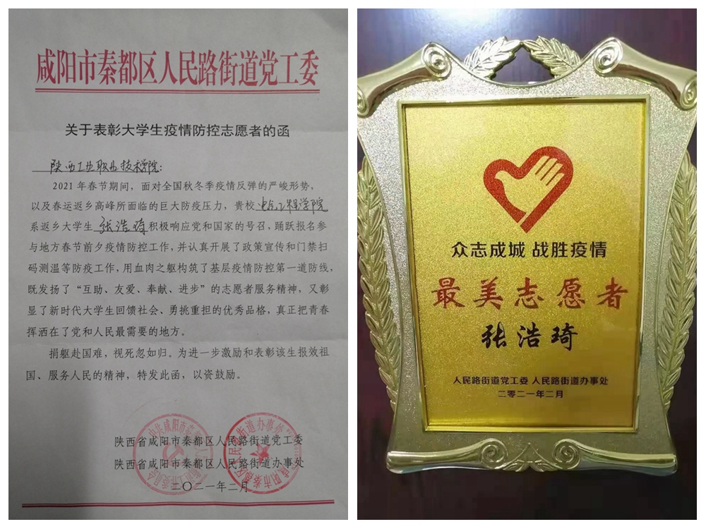 近日,我院收到咸阳市秦都区人民路街道党工委发来关于表彰大学生疫情防控志愿者的函,表扬电气自动化技术2006班同学张浩琦积极主动加入疫情防控志愿服务队伍,为当地疫情防控工作做出奉献,并对我院的人才培养工作给予了肯定与感谢。