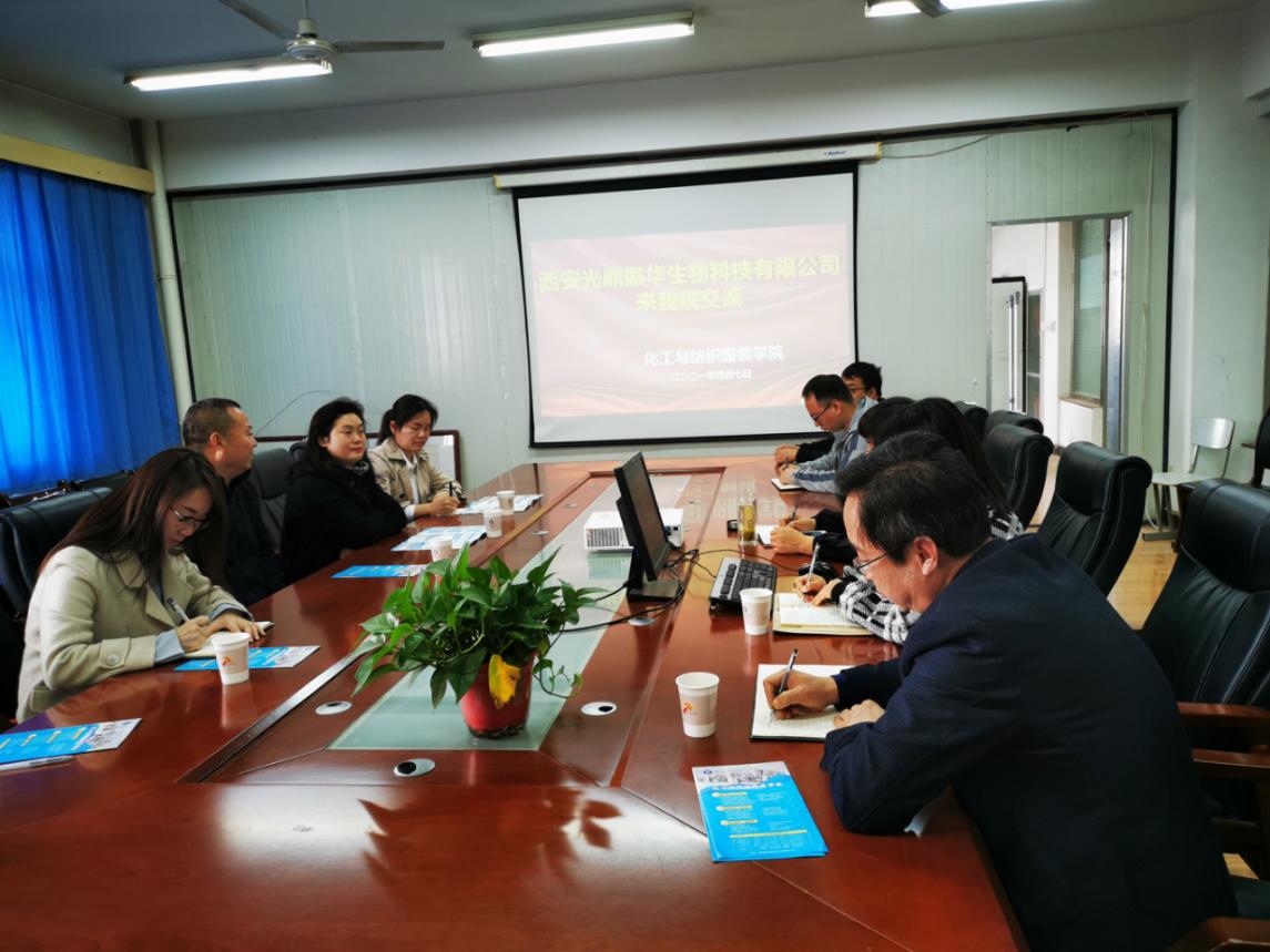 4月7日上午,西安光鼎振华生物科技有限公司一行代表来我院进行交流,化纺服学院党总支书记贾格维、院长王化冰、副院长刘迪等出席会议。