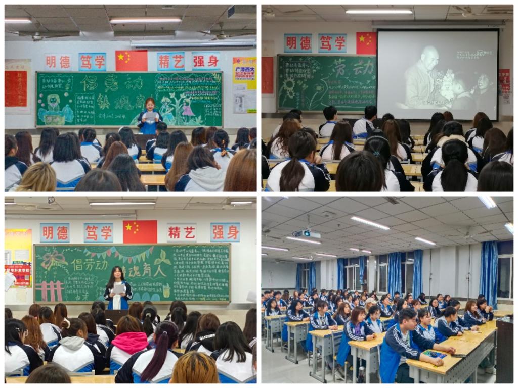 为贯彻落实我国的优秀传统教育——劳动教育,培养我院学生的劳动观念、树立艰苦奋斗的精神,让学生认识到劳动的重要性,进一步弘扬劳动精神。在中国共产党成立100周年,第71个中国劳动节、第131个国际劳动节来临之际,财经与旅游学院积极响应学校号召,于4月21日晚在2019、2020级晚自习教室,开展了以“倡劳动铸魂育人”为主题的班会。