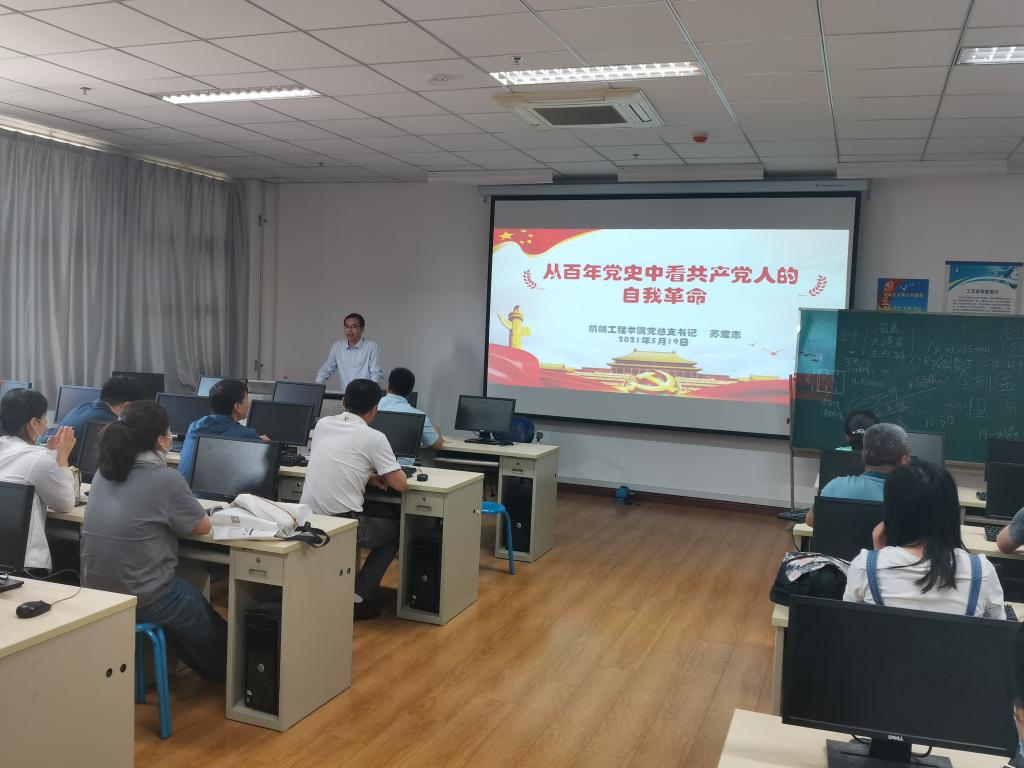 5月20日下午在精艺楼2014实训室,机械工程学院党总支书记苏宏志为全体党员讲授了一堂题为“从百年党史中看共产党人的自我革命”的生动党课。