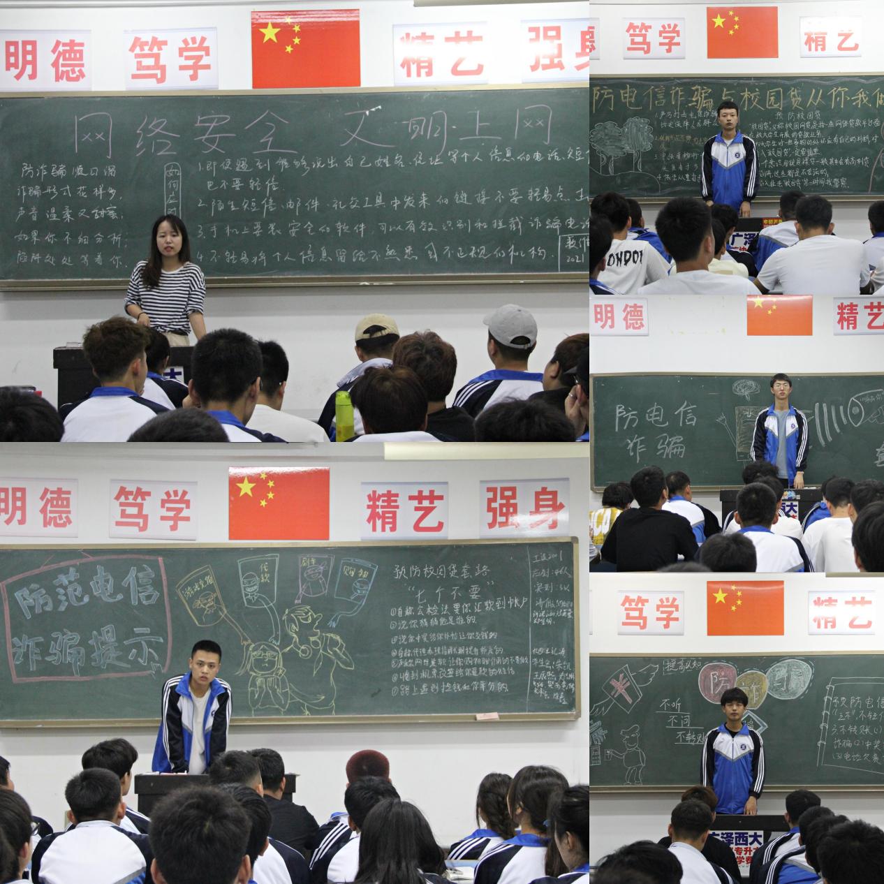 本次主题教育班会中,各班主任为同学们讲解电信诈骗及校园套路贷的相关案例,班委领学并布置相关黑板报,通过观看相关视频、案例分析以及集体讨论等形式让同学们更加真实的感受到校园贷和电信诈骗给大学生带来的危害,同时也让大家懂得了保护自己的私密信息的重要性,不贪图小便宜,在学校要注意保护自己的人身和财产安全。最后,各班班委及学生代表上台结合身边的实例对此次教育活动的感想进行了分享,引起了同学们的共鸣。