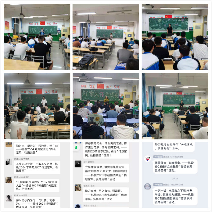 各班班主任首先带领同学共同观看视频学习资料在“清廉工院”公众号下找“德润三秦”好家风系列微视频展播。随后学习电子版学习资料《中国历代家训集锦》。最后各班开展“传颂家风、弘扬美德”分享及班级群跟帖活动,除了在班会上进行家风家训分享外,通过班级群传颂家风,发布家风家训。通过展示家风家教名言、讲述家风家教故事、分享家风家教感人事迹等系列活动,倡导尊老爱幼,助人为乐,勤俭节约,诚实守信,勤奋学习,从小养成良好的习惯,树立良好的家风家教。