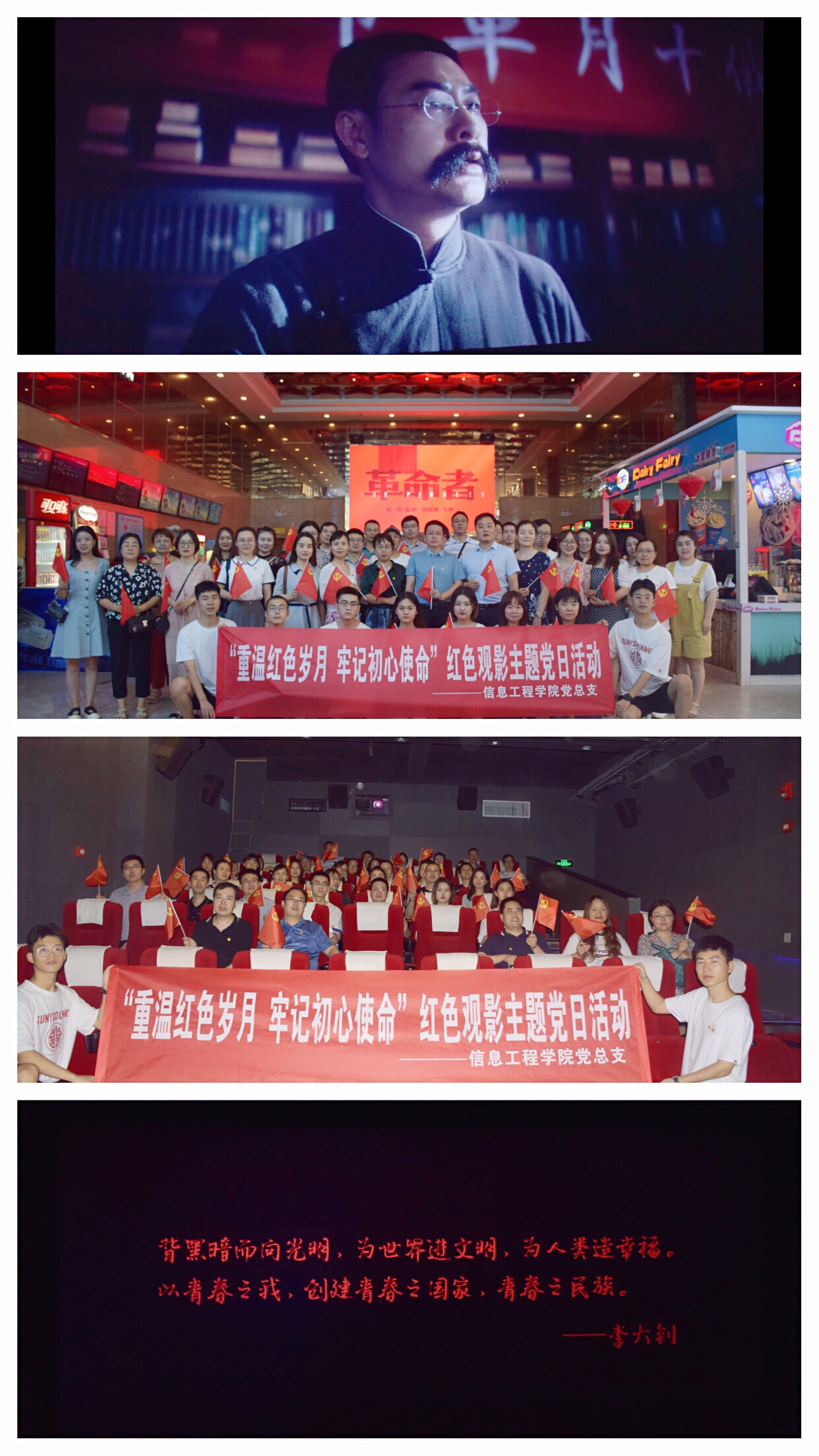 为庆祝中国共产党成立100周年,不断丰富党史学习教育形式,强化学习教育效果,持续深入推动党史学习教育走深走实,7月7日晚,信息工程学院党总支组织全体教工党员及学生党员60余人集中观看百年献礼影片《革命者》,开展“重温红色岁月,牢记初心使命”主题观影活动。