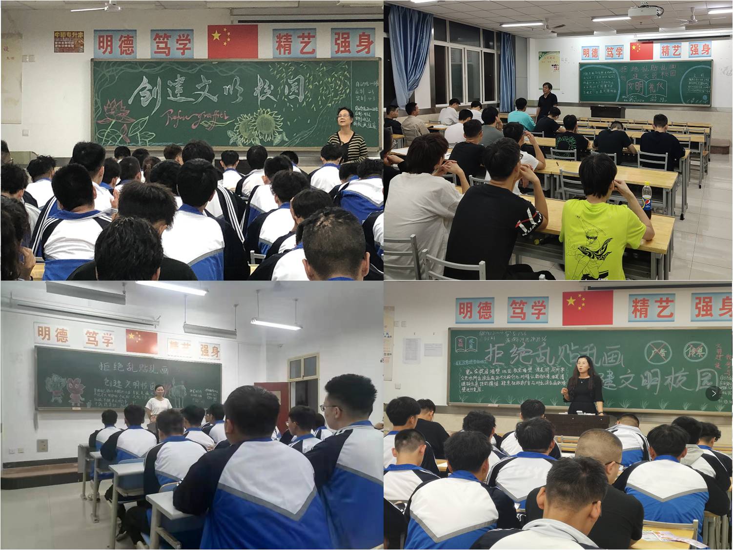 根据学工办部署安排,同学们围绕活动主题精心设计了主题板报,为活动的开展营造了良好氛围。班会期间,各班主任传达了校领导对于教室内、校园里张贴的各类野广告进行专项整治的具体要求,同学们认真学习,集中清理了桌面墙面卫生。同时要求学生严格进行自我管理、自我监督、自我约束,严厉禁止在校园内乱写、乱画、乱贴广告标语,用自己的实际行动维护校园的安全整洁。