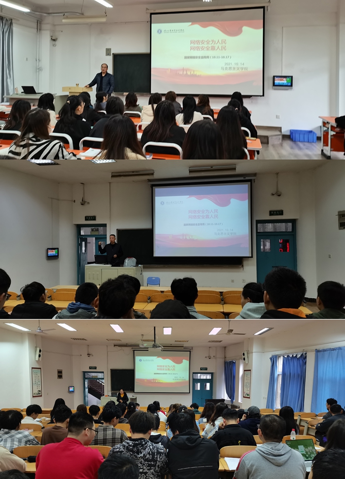 在国家第八届网络安全宣传周活动开展之际,为加强我校广大学生网络安全教育,10月14日,党委宣传部、马克思主义学院联合开展了网络安全知识宣讲进课堂活动,马院思政课教师积极利用思政课渠道为广大学子进行了网络安全意识教育。