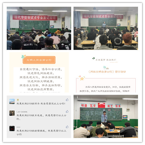 机械学院通过学院公众号发起了“《网络文明自律公约》签定活动”,通过留言签名的方式,动员学生坚守法律底线,坚持文明上网,提高学生网络安全意识,争做网络法制的建设者和网络安全的维护者,共同奏响网络文明的和谐之音。10月24日在各班晚自习教室,以班为单位,开展了“守护网络安全,构建和谐校园”网络安全线上“云课堂”主题班会,通过观看丰富多样的线上课程,让同学们更进一步了解网络安全的含义和范畴,掌握信息时代正确的网络安全观,同时鼓励同学们积极讨论和交流,强化对网络安全的认识,倡导大家将所学知识传播给身边的朋友们,提升青年一代的国家网络安全观。