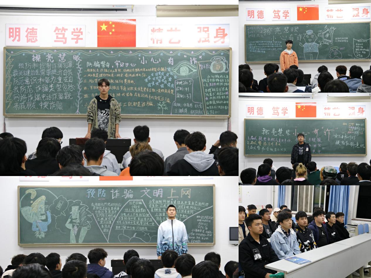为增强学生安全防范意识,加强自我保护,有效遏制电信网络诈骗案件的发生。2021年11月1日,航空工程学院组织20级、21级全体学生于各班晚自习教室开展了“擦亮慧眼,小心有诈”主题班会教育活动。