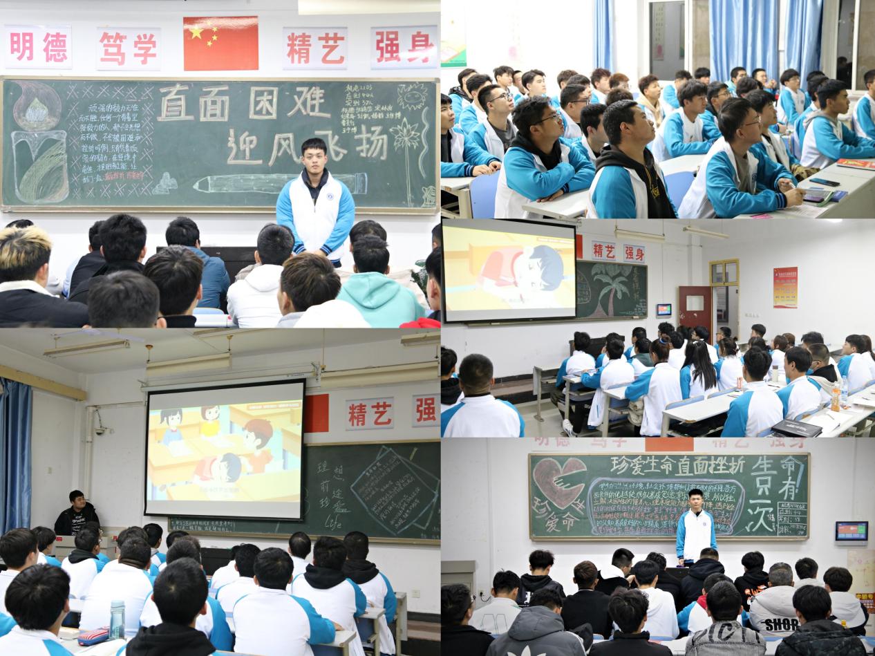 班会上,首先由各班班委通过多媒体课件、视频等形式,结合生活中具体的事例对学生进行深刻教育,同时选取案例进行分析,并向同学们介绍 “及时调整”、“正确归因”、“合理宣泄”、“接纳自我”等面对挫折的方法,引导学生勇敢面对生活中的困难和挫折,勇于挑战自我,寻求解决问题的方法。其次,学生代表发表了自己的见解,向同学们分享了自己平时遇到挫折时所采取的措施以及怎样战胜挫折。最后,通过“感恩生命中的每一个人”主题演说,引导学生感恩父母的养育、老师的教导、朋友的相助,感受生命的精彩,热爱生命的美好,尊重、敬畏生命。