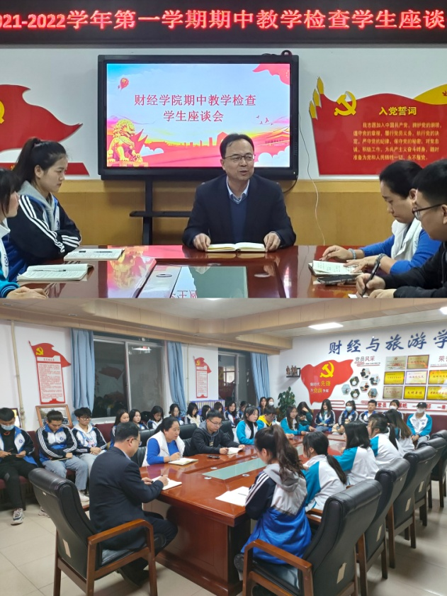 为全面了解教学情况,及时倾听学生的意见和建议,改进教学和管理工作,加强师生联系。11月12日下午,财经与旅游学院在格物楼408会议室,召开了2021-2022学年第一学期期中教学检查学生座谈会。参加座谈会的有财经与旅游学院党总支书记孙继龙、学工办主任杜娟、2020级辅导员狄莹莹、王甲鸣老师及2020级、2021级学生代表共40余人。