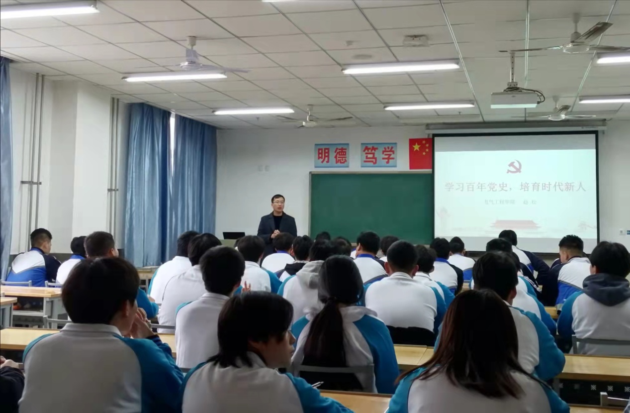 11月17日下午,为深入开展党史学习教育,激励青年学子铭记党的光辉历程,坚定理想信念,电气学院党总支学生第二支部书记在崇明楼502教室给全体发展对象、入党积极分子等100余人开展讲党课活动。