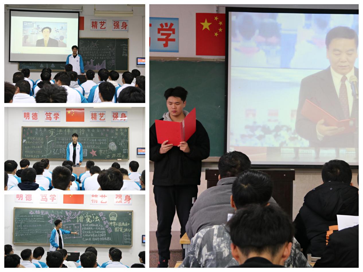 11月28日晚在各班晚自习教室,组织大一、大二开展“学宪法、讲宪法”主题班会。各班同学精心布置板报,提前筹备宪法知识内容,采取宣讲、讨论、统一观看宪法知识视频等方式学宪法,讲宪法,感悟宪法权威,增强法制意识。11月30日晚,组织各班开展“宪法知识竞赛”活动。通过知识竞赛,培养了青年大学生的国家主人翁意识和法治观念,激发了对宪法知识热爱和学习的热情,让同学们能够运用宪法维护自身、集体和社会公共权益,做到知法、懂法、守法、用法,营造出人人学宪法、人人讲宪法的良好氛围。12月3日上午,组织无课程安排的班级进行宪法晨读直播活动。首先,学生干部介绍国家开展宪法日活动基本情况,其次班级团支书选择宪法序言及正文中的部分章节、条款组织学生集体朗读。所有人精神饱满,情绪激昂,大声跟随诵读,用心体会宪法的庄严与神圣。