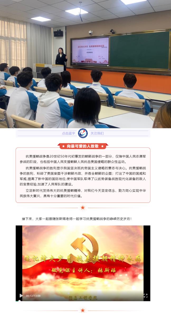 “线上”搭建口袋式微课堂,强化网络红色革命精神因子。依托信息学院“信言信语”新媒体公众号平台,辅导员张斯瑶在“线上”发表以“追忆烽火岁月,抗美援朝精神永存”为主题的网上微党课。10分钟的微党课以战争综述—艰难开国第一战、抗美援朝—英雄联盟永垂不朽、山河无恙—赓续革命精神血脉三个模块详细生动地阐释了抗美援朝的历史经过和重要意义,从而激发“祖国和人民利益高于一切”的家国情怀,坚定“舍生忘死、保家卫国”的革命英雄主义精神,坚定“不畏艰难困苦”的乐观主义精神。利用“线上”新媒体网络平台,让学生在“线上”研习中国共产党历史,厚植红色革命情怀。