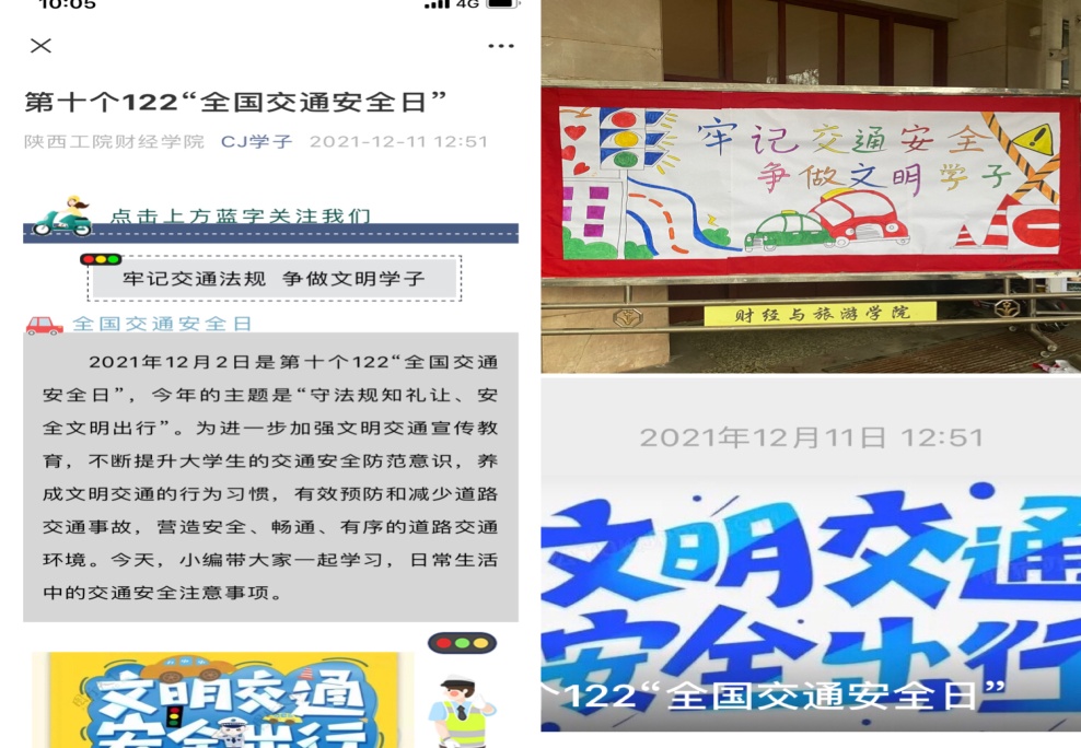 为深入贯彻习近平法治思想和关于安全工作的重要论述,落实学校关于《第十个“全国交通安全日”》活动部署,在广大学生中倡导“生命至上,安全第一”的理念,进一步加强文明交通宣传教育,不断提升大学生的交通安全防范意识,有效预防和减少道路交通事故,营造安全、畅通、有序的道路交通环境。财经学院于12月13日到17日,开展了以“牢记交通安全、争做文明学子”为主题的系列教育活动。
