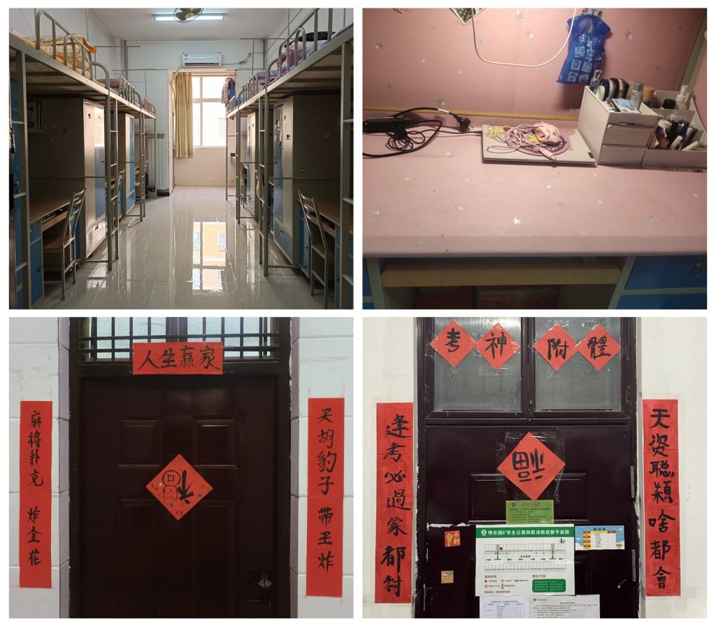 元旦当天,同学们积极响应动员,积极投入到“迎新年 大扫除”活动中去,热火朝天的忙碌着。首先,整理宿舍各处杂物,清理掉不需要的东西,其次,对宿舍每个角落认真打扫清洁,最后,每个同学都认真整理收拾自己的衣物和床铺。经过同学们的认真清理打扫,宿舍放眼望去,干净整洁,焕然一新。打扫完毕,同学们写起了对联与福字,贴在宿舍门上,让年味浓了不少。