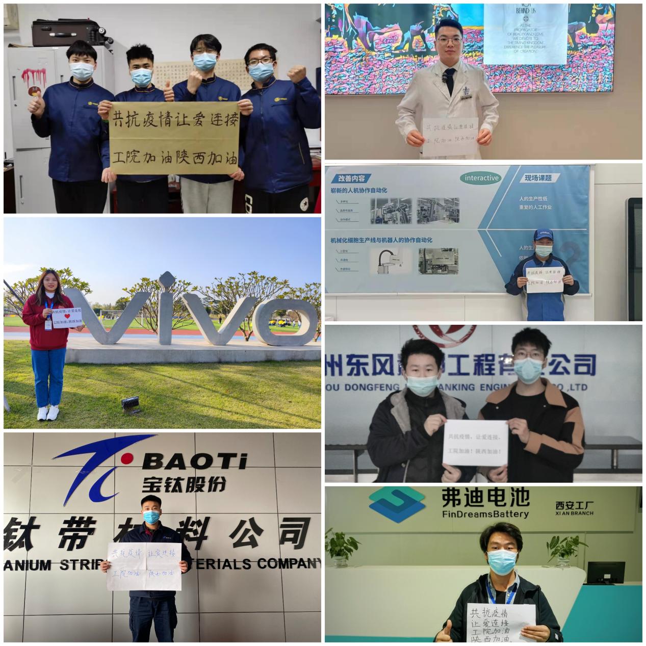 同学们自发组织拍摄正能量的视频和照片为学校疫情防控加油,一段段情词恳切的话语,一张张青春洋溢的照片,无不展现了机械学子的青春风采。他们秉承陕西工院“明德、笃学、精艺、强身”的校训,勇于担当社会责任,肩负青春使命。部分企业代表也参与其中,通过视频和照片表达了自己对陕西工院、对在校师生的美好祝愿。
