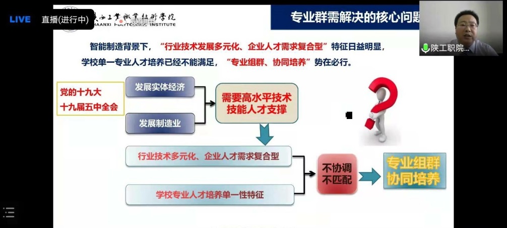 2022年1月10日,由中国职业技术教育学会主办,重庆工业职业技术学院承办的第十一届“说专业•说课程•说专业群”研讨会以线上、线下相结合的方式举行,我校机械制造与自动化专业群受邀参加此次会议,专业群带头人赵明威教授在“说专业群”板块进行主题发言。