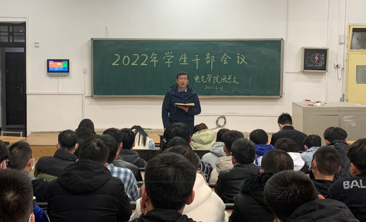 为督促学生干部队伍全面增强凝聚力、提高服务管理能力、提升整体综合素养,展现学院学生组织风采,进一步发挥学生干部的模范带头作用,推进电气学院各项工作正常运行,2月27日下午,电气学院在崇文北楼阶梯教室召开全体学生干部会议,会议由电气学工办主任赵松老师主持。
