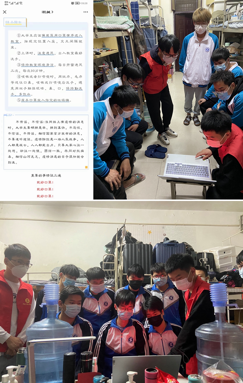 思想认识落实到位。机械学院党总支高度重视疫情防控工作,前期召开多次疫情防控工作会议,部署学院疫情防控工作。学院党总支书记苏宏志及时向全体辅导员、班主任传达学校疫情防控工作会议精神,要求全体学工干部提高政治站位,强化思想认识,遵守学校防疫要求,履行个人职责,落实好学校疫情防控的各项要求。封校期间要求全体辅导员、班主任深入宿舍,掌握学生最新动态,做好思想及心理引导。