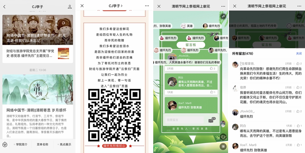 为传承中华优秀传统文化,弘扬爱国主义精神,营造铭记烈士、追思英雄的良好文化氛围,财经学院举办了清明“纪念英烈”网上祭扫宣传活动。本次活动将新媒体与传统节日相结合,通过网上学习、浏览戍边战士的英雄事迹,倡导同学们进行网上献花、网上留言、文明祭祀,让同学们了解更多先烈们的英雄事迹,加强爱国主义教育。