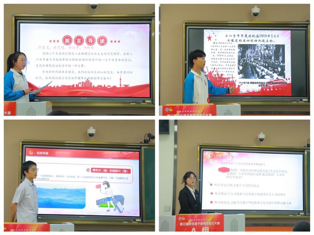 为贯彻落实《共青团中央2022年工作要点》中深化党史学习教育的相关安排,结合我校《关于开展“喜迎二十大、永远跟党走、奋进新征程”主题教育实践活动的通知》精神,校团委在崇文南楼智慧教室举行第三届学生团干部素质能力大赛决赛。来自全校十个二级学院的90余名参赛选手分四组进行决赛比拼。