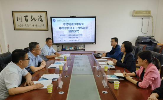 签约仪式上,首先,李云院长对屈浪山副校长一行的到来表示热烈欢迎。在观看完学院宣传片后,李云院长从我院的基本办学情况、近年来学院的发展、增材制造技术专业现状等方面进行了简要说明,并重点介绍了学院“3+3”联合办学思路和成功案例。其次,屈浪山副校长对我校取得的成绩表示赞赏,并简要介绍了陕西省商贸学校的基本情况,表达了双方就中高职贯通“3+3”合作办学的意愿。随后,双方就“3+3”联合办学中的师资培养、学生实训和技能强化训练等合作内容进行了深入的交流。最后,李云院长与屈浪中副校长签署了中高职贯通“3+3”合作办学协议,后续双方将开展深入具体的合作事宜。