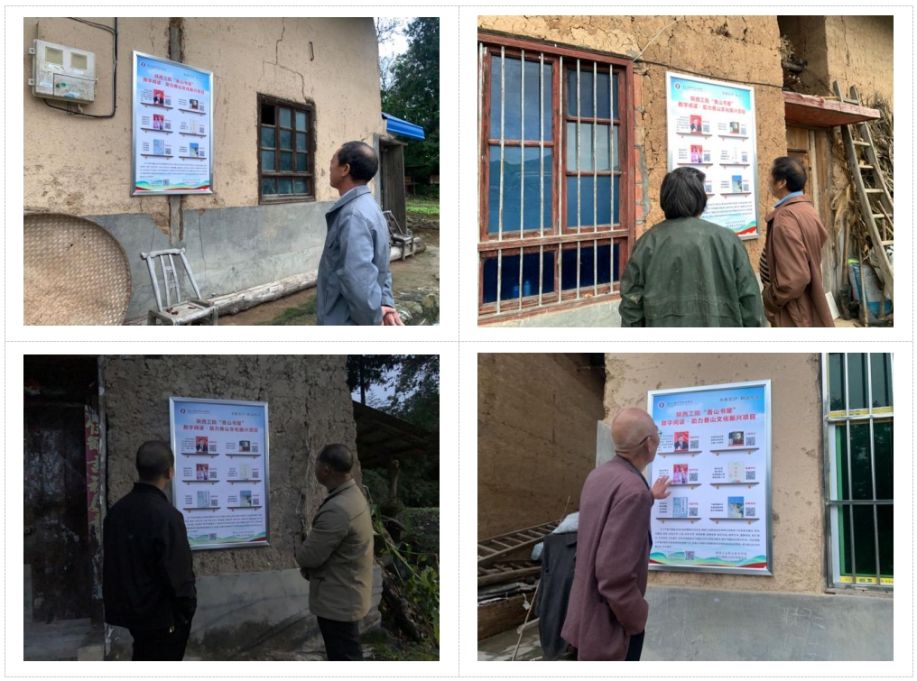 为提升村民的文化文明素养,结合香山村实际情况,考虑到大部分村民都使用智能手机的现状。今年,陕西工院特购买了价值17000余元,包含政治理论、新农村建设、党史、红色文学、小说、纪实文学、传奇故事、军事战争、曲艺作品、相声艺术、重要讲话、旅行游记、文化风俗、文化遗产、知识科普等多个门类的14053本电子图书(部分书籍还可进行听书),制作成电子图书展板悬挂在村委会和11个村民小组醒目位置,方便村民阅读。村民徐勋义说:“这是好事,坐在家门口都能看书,不认字的还能听,太方便了。谢谢帮扶咱们的陕西工业职业技术学院,是你们给我们山区群众带来了丰富的精神大餐啊!以后,有了空闲,我们也可以随时随地学习和娱乐了。”
