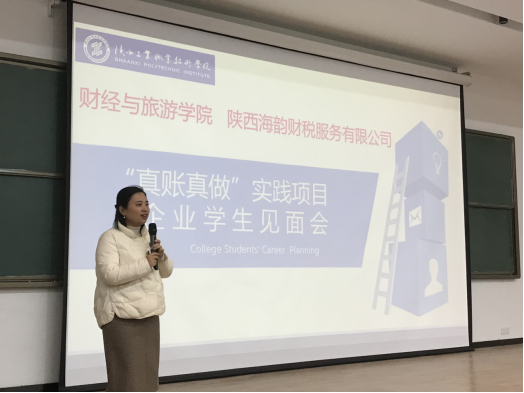 为全面贯彻《国家职业教育改革实施方案》《职业教育提质培优行动计划(2020—2023年)》《陕西省职业教育改革实施方案》《会计行业中长期人才发展规划(2010—2020年)》等系列文件要求,高质量落实《陕西工业职业技术学院人才培养提质增效“四优工程”实施方案》,11月16日,财经与旅游学院在经开校区崇理楼E100阶梯教室,举办智慧财经工匠班“真账真做”实践项目见面会。会议由大数据与会计专业带头人元媛老师主持,陕西海韵财税服务有限公司总经理南红芳、会计教研室全体老师、大数据与会计专业和大数据与财务管理专业320余名学生参加了会议。
