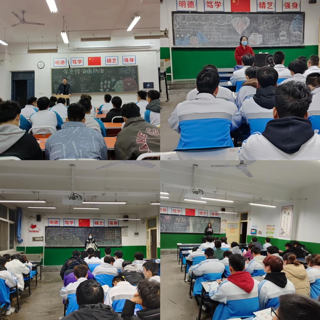 各班干部组织本班同学集中学习流感、诺如病毒、流行性腮腺炎、细菌性结膜炎、肺结核、手足口病、水痘等冬季常见传染病的症状、传播途径及预防措施。大家在互动提问、小组讨论交流中认识到传染性疾病对自己及他人身心健康的危害,培养良好的卫生和生活习惯的重要性。班主任老师在最后的活动总结中强调注意个人饮食及生活习惯,教室及宿舍常开窗通风,积极参加户外活动,增强身体免疫力,预防疫病发生。