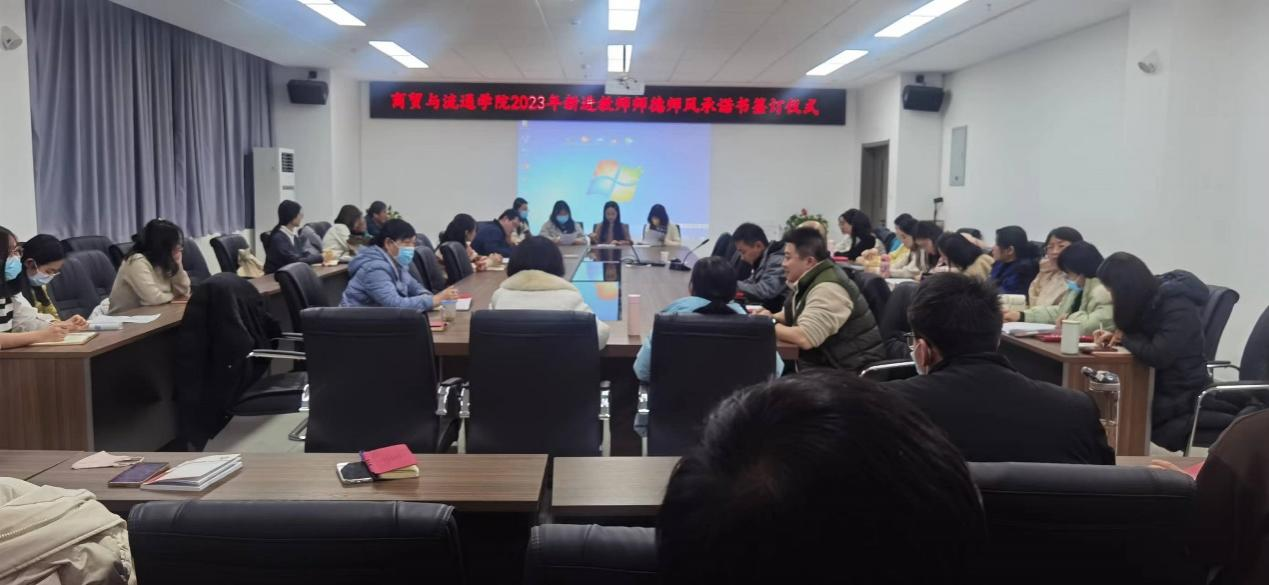 为认真落实《教育部关于建立健全高校师德建设长效机制的意见》《中共中央国务院关于全面深化新时代教师队伍建设改革的意见》《新时代高校教师职业行为十项准则》等文件精神,更好地履行教师职业道德,树立高尚的师德形象,2023年12月25日商贸与流通学院组织2023年新进教师开展师德师风承诺书签订仪式。会议由副院长张光同志主持,全体教职工参加。