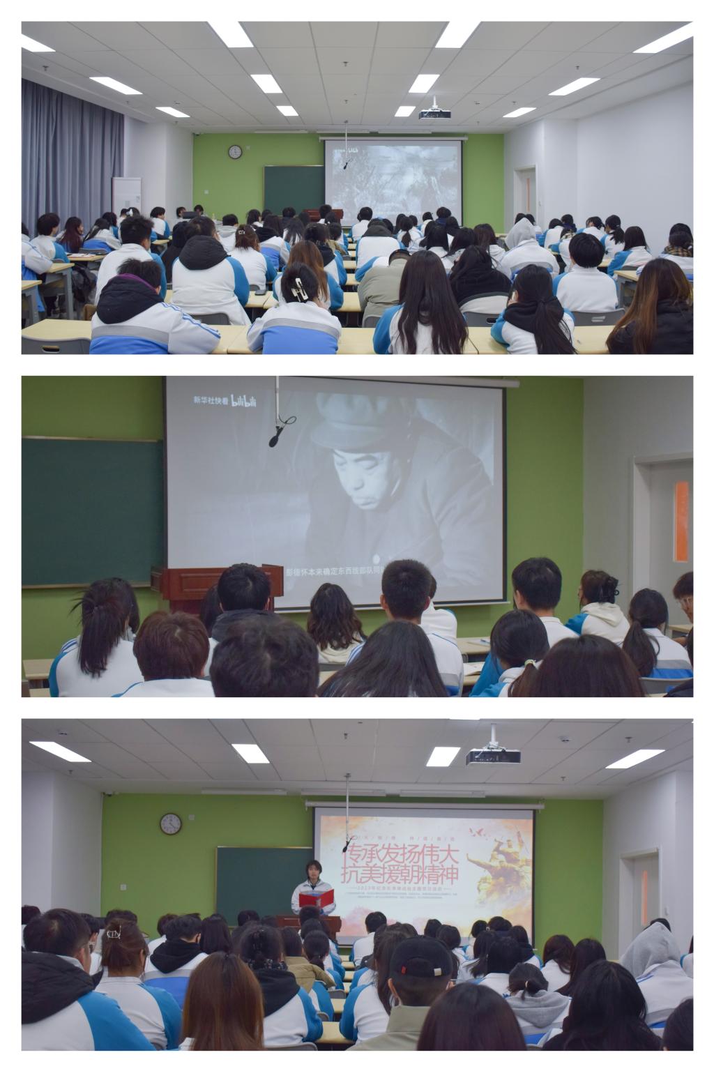 大家集中观看红色纪录片《冰雪长津湖》,纪录片以抗美援朝战争中的长津湖战役为背景,真实、客观地再现了当年志愿军抗美援朝的战争史实;影片以志愿军老战士的追忆和描述为表现主体,结合人物采访、影像资料展示等方式,从平实朴素的角度还原了朝鲜战争中志愿军将士历经艰难险阻、突破生死绝境的感人壮举;影片使在场的同学无不为长津湖之战的伟大与不朽感到震撼,激励和引导大家追忆峥嵘岁月,感受先辈们为了国家和民族的繁荣与安宁付出的巨大牺牲,再次按受到国主义精神洗礼。