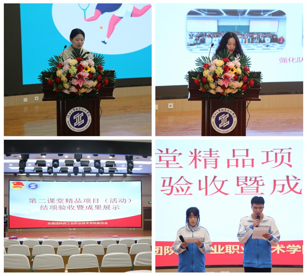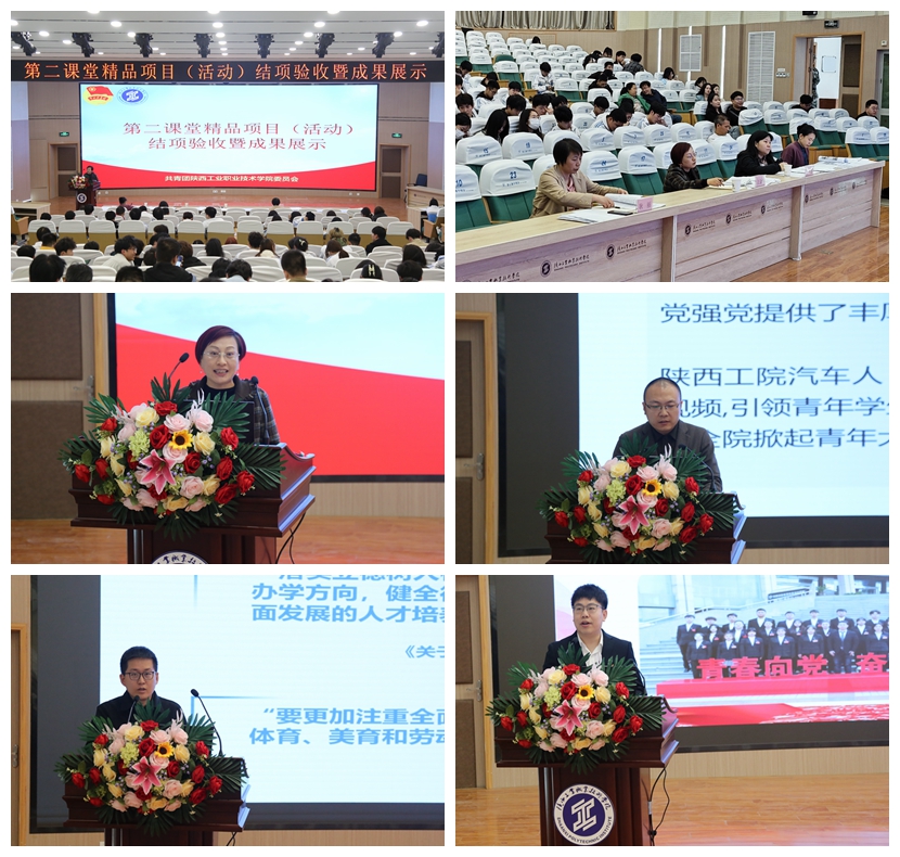 为贯彻落实《深化新时代教育评价改革总体方案》《关于深化现代职业教育体系建设改革的意见》《关于在高校实施共青团“第二课堂成绩单”制度的意见》等要求,结合《陕西工业职业技术学院“第二课堂成绩单”制度管理实施办法》的相关内容,3月27日下午,校团委在渭城校区学术会堂举办第二课堂精品项目(活动)结项验收暨成果展示。宣传部部长王金辉、马克思主义学院院长舒蕾、学生处副处长耿丽担任评委,各项目(活动)负责人、二级学院师生团干部以及学生代表等200余人参与了本次活动。