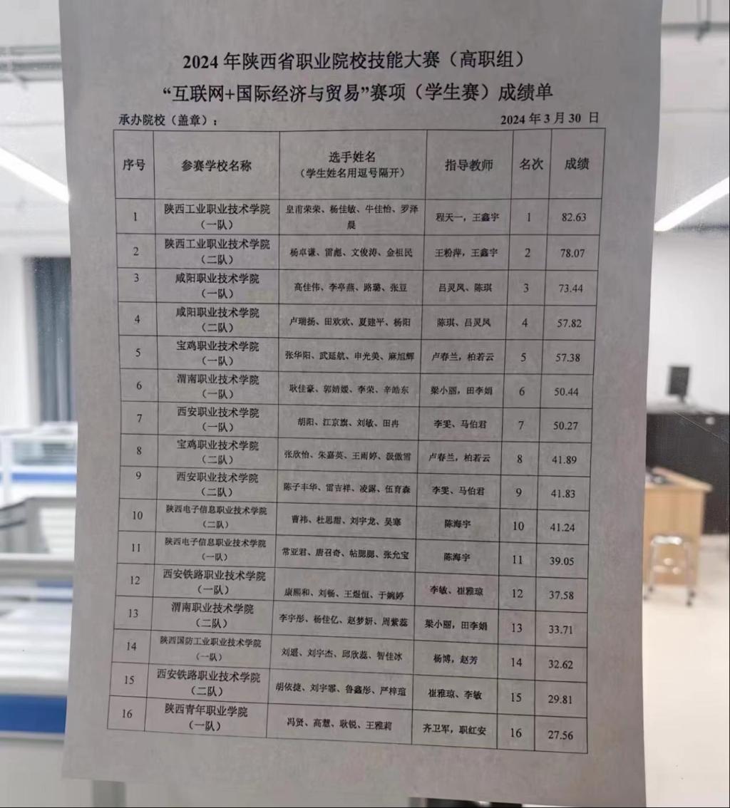 3月29日至3月30日,陕西省职业院校技能竞赛“互联网+国际经济与贸易赛项”顺利落下帷幕,全省共有10所院校、19支代表队76名选手参与。我校商贸与流通学院共有两支参赛队伍,分别由王鑫宇、王粉萍、程天一老师指导。经过激烈角逐,由皇甫荣荣、杨佳敏、牛佳怡、罗泽晨4名同学组成的代表队获一等奖第一名,由杨卓谦、雷彪、文俊涛、金祖民4名同学组成的代表队获一等奖第二名。