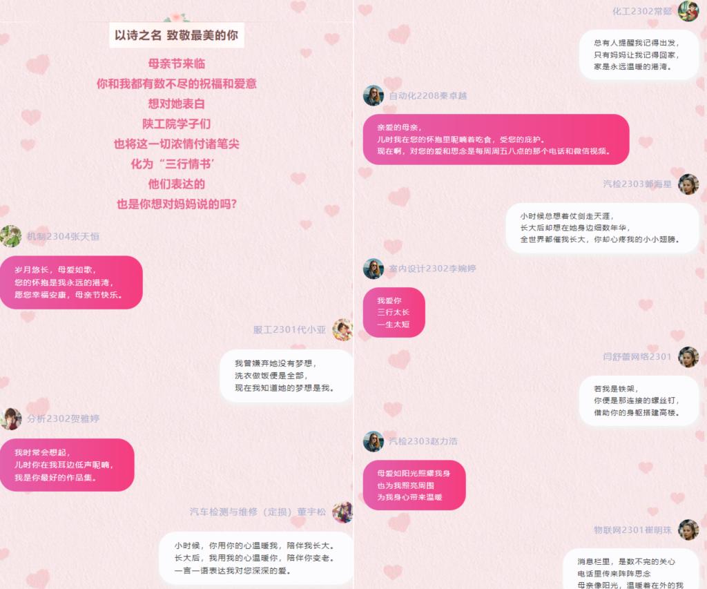 此次活动的成功举办,得到了在校同学的积极响应和热烈参与。同学们纷纷拿起笔,用心书写着对母亲那份独特的情感。每一封三行情诗,都充满了对母亲深沉而真挚的爱意、或温暖、或感动、或俏皮、或深情,展现出了同学们不同的性格和对母亲不同的表达方式。