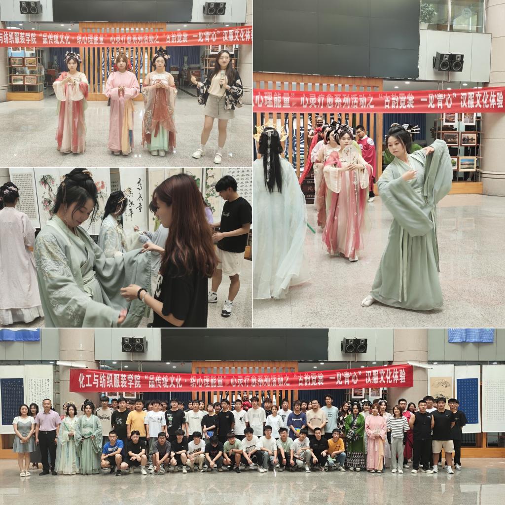 为创新学生心理健康教育内容形式,发挥美育丰富精神、温润心灵作用,有效引导学生自觉学习心理调适方法,培养积极向上的健康心态,5月23日下午,化工与纺织服装学院阳光心情工作站开展心灵疗愈系列活动之“古韵霓裳·一见'青'心”汉服文化体验活动。化工与纺织服装学院学工办主任、服装教研室教师等200名师生共同参与了本次活动。活动由心理专干曹淼主持