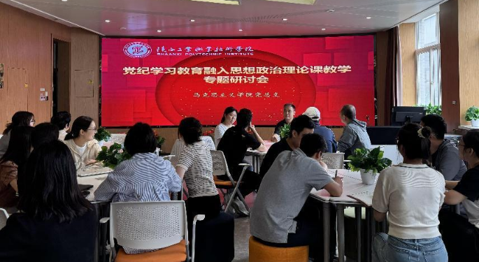 ——开展党纪学习教育融入思政课教学专题研讨会。5月15日下午,马院党总支在VR实训中心召开党纪学习教育融入思想政治理论课教学专题研讨会,探讨将党纪学习教育有机融入思政课教学的实现途径。学院全体教师参加研讨会,会议由总支书记舒蕾主持。