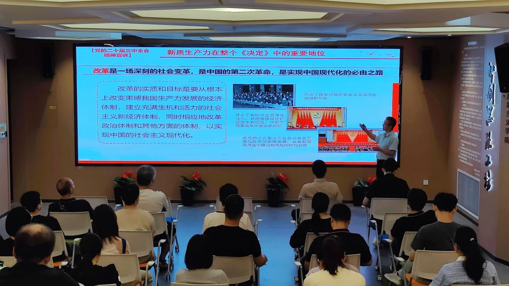 张金英博士紧紧围绕党的二十届三中全会的指导思想、主要内容、重大意义等方面,作了全方位、深层次、多维度的深度诠释,号召广大教师认真落实全会关于深化教育综合改革的新部署新要求,将新部署新要求转化为推动学校各项事业改革发展的强大动力。秦马研习社学生宣讲员郭书辰同学,用深入浅出的青年语言讲述了党的二十届三中全会的历史意义,号召同学们把自己的理想同祖国的前途、民族的命运紧密联系在一起,踔厉奋发、勇毅前行,为推进新时代中国式现代化贡献青春力量。
