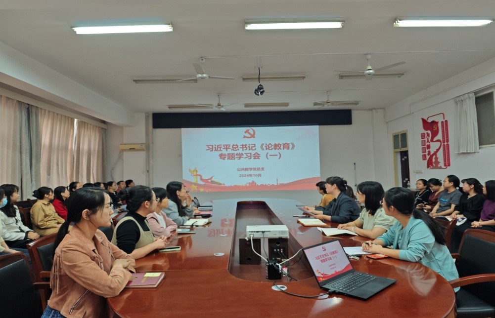 为深入学习贯彻习近平总书记关于教育工作的重要论述和指示批示精神,准确把握建设教育强国的丰富内涵和重大意义,公共教学党总支于10月23日下午开展习近平总书记《论教育》专题学习会。公共教学党总支书记赵娇主持会议,全体党员参加学习。