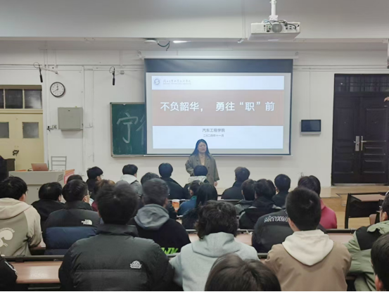 为助力2025届毕业生明晰就业形势、提升就业技能,11月21日晚,汽车工程学院举办了主为“不负韶华、勇往‘职’前”就业指导专题讲座。此次讲座由汽车工程学院学工办主任胡瑞霞主讲,100余名毕业生参加。