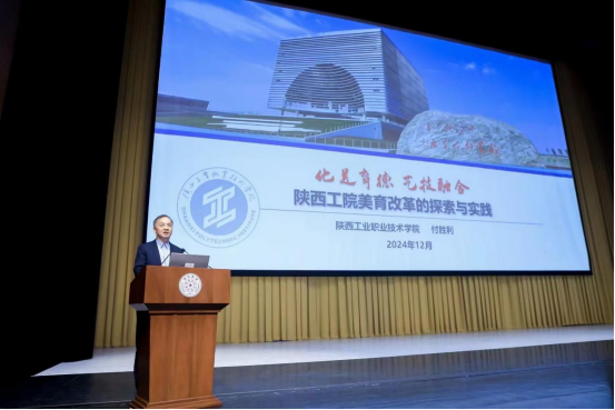 我校美育部部长付胜利以《化美育德,艺技融合——陕西工院美育改革的探索与实践》为题代表学校发言,他首先介绍了我校美育工作概况,随后从思路与目标、举措与路径、成效与思考等三个部分依次阐述了我校美育改革的新思路、新目标、新举措和对高职美育问题的思考,并表示今后我校将持续改革创新,补足短板,为高职美育贡献陕工力量。付胜利部长的发言得到了与会领导、专家和代表的高度评价与认可。