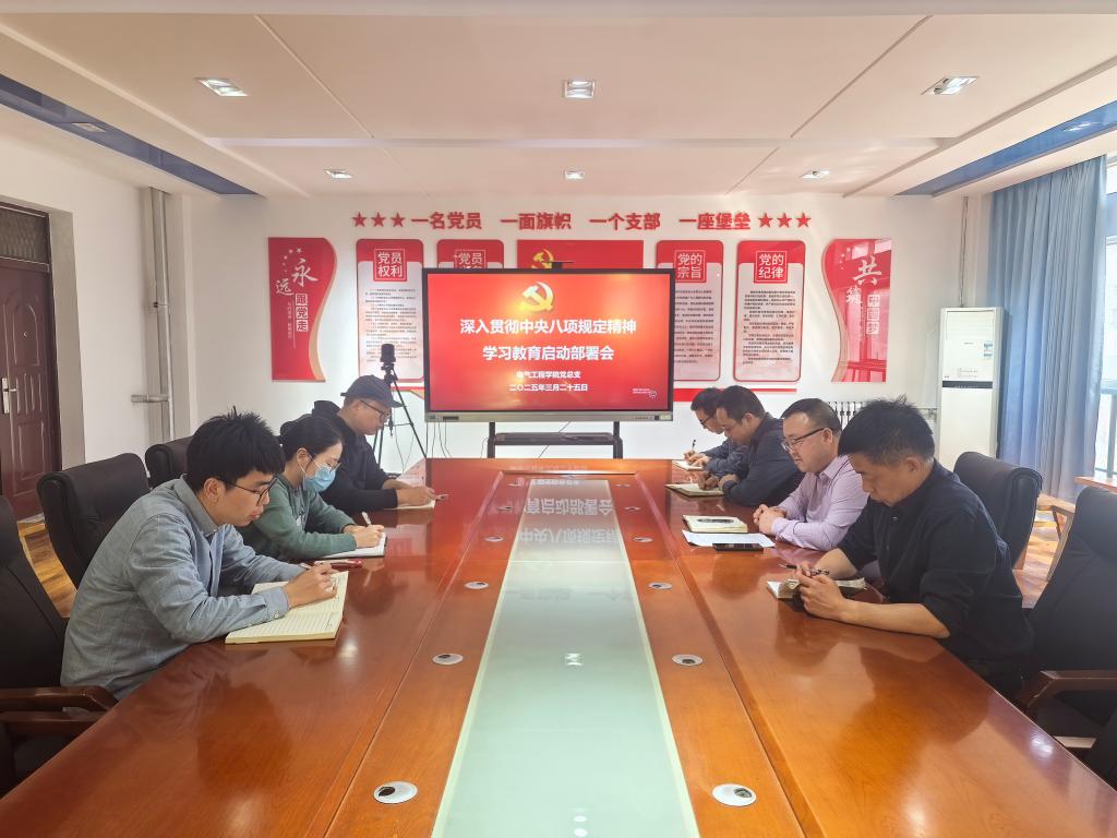 3月25日下午,电气工程学院在行知楼A506会议室召开深入贯彻中央八项规定精神学习教育启动部署会,学院党总支班子成员及各支部书记参加会议,会议由电气工程学院党总支书记刘其兵主持。