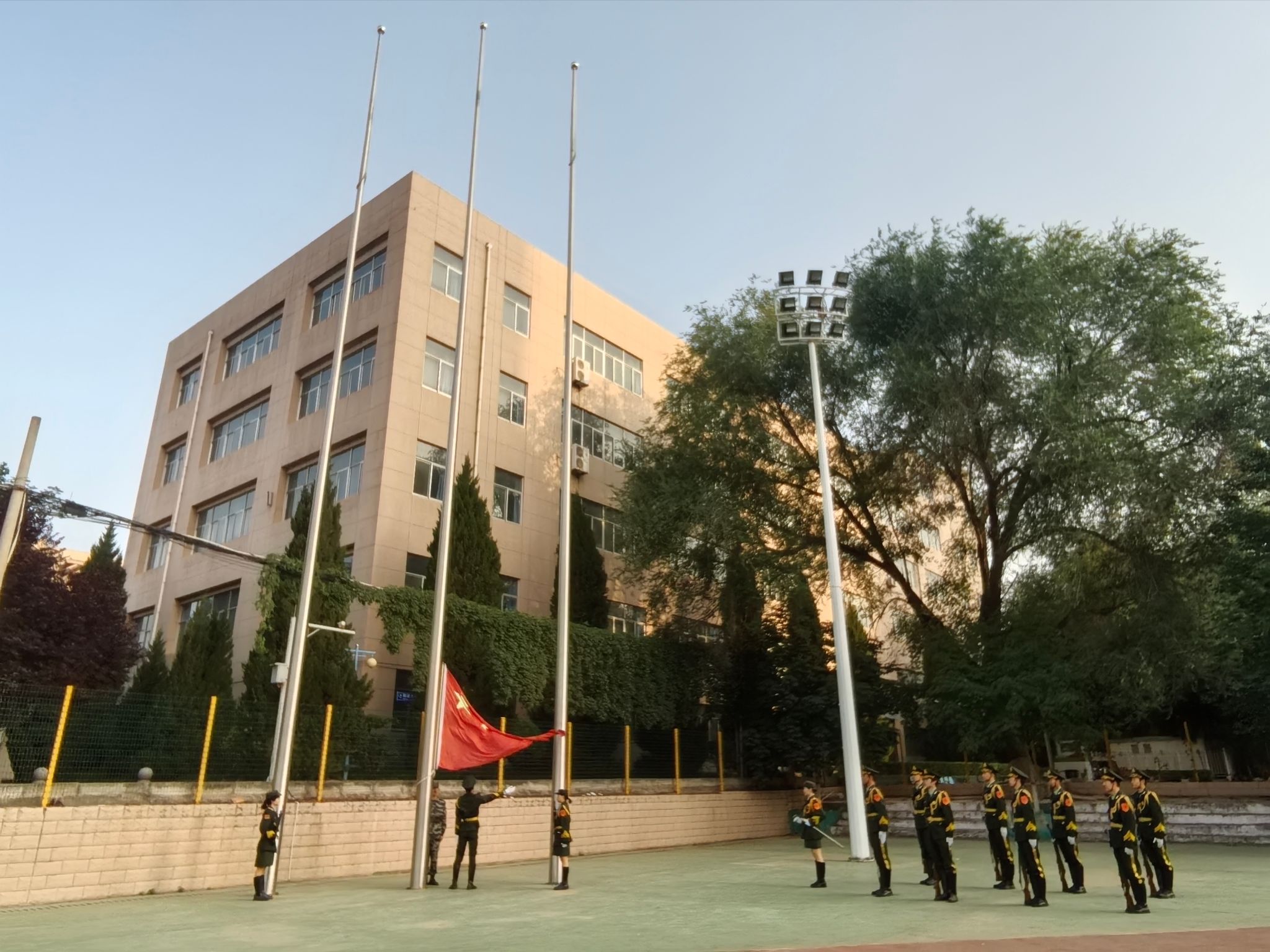 6时50分,国旗护卫队迈着铿锵有力的步伐护卫国旗入场。随着《义勇军进行曲》的嘹亮奏响,全体师生神情肃穆,面向国旗行注目礼,五星红旗在晨风中与朝阳同升。