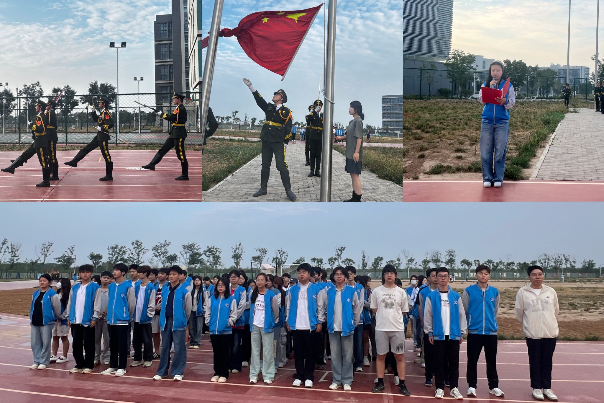 6点50分,升旗仪式正式开始。国旗护卫队队员们迈着坚定有力的步伐,喊着嘹亮的口号,护送鲜艳的五星红旗走向升旗台。伴随着雄壮的国歌声,五星红旗冉冉升起,全体师生面向国旗行注目礼。