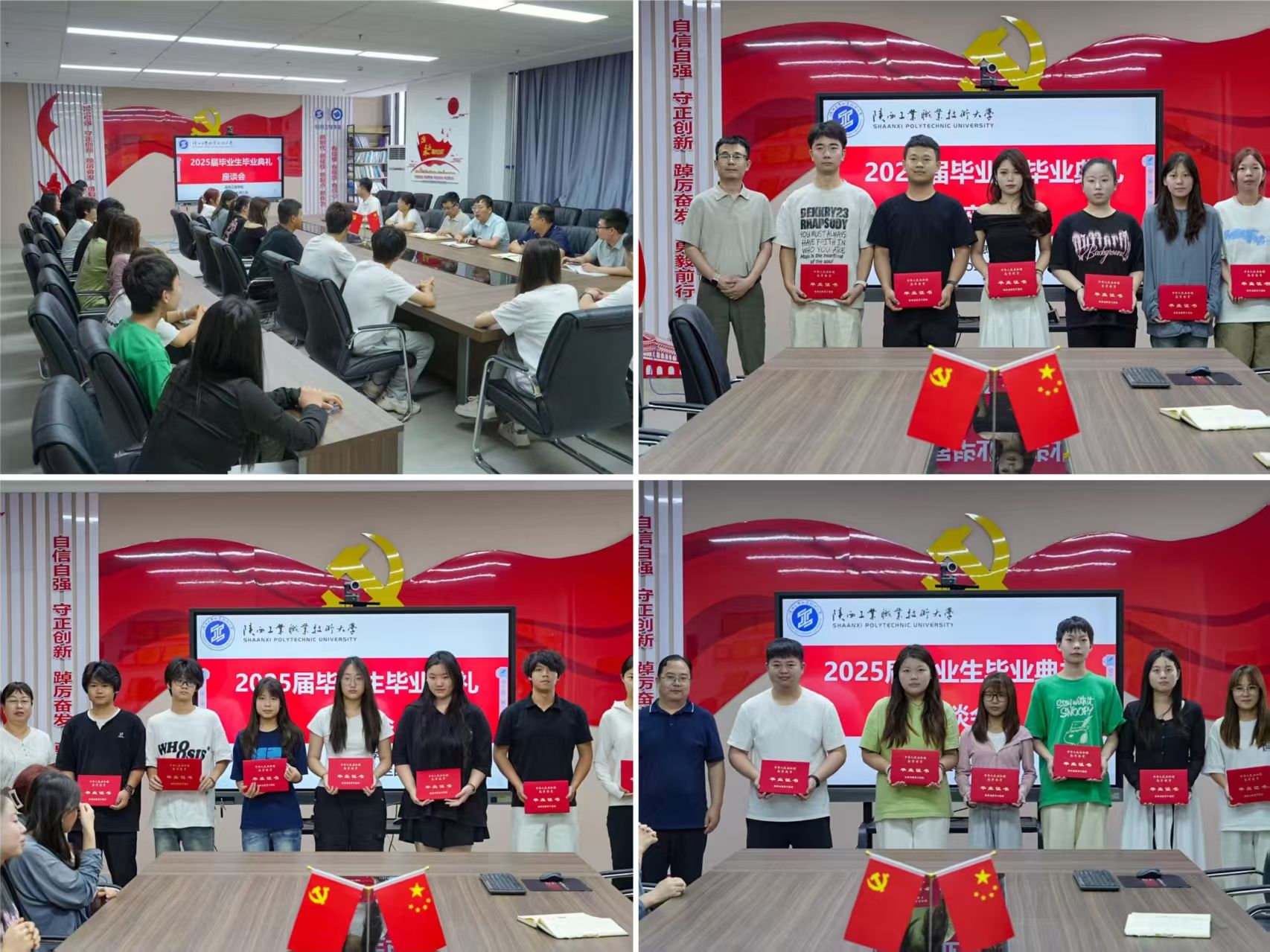 座谈会上,毕业生代表积极发言,分享毕业去向和就业经验,畅谈人生感悟,表达对母校的不舍、对学院、老师的感激之情以及对学弟学妹殷殷嘱托,并表示将继续关注学院的发展,为学院的建设贡献自己的力量。随后,现场举行了毕业证书颁发仪式,学院领导们依次走到毕业生代表面前,亲手将毕业证书递到毕业代表手中,并进行合影留念,现场不时响起热烈的掌声。最后,党总支书记王伟对2025届毕业生顺利毕业表达祝贺,对同学们为学院的建设与发展表示感谢,同时向毕业生提出三点希望:一是希望能以陕工校友的身份将人生经验、职场经验传递给更多的陕工学生,以实际行动回报母校;二是希望同学们时刻铭记着自己是陕工人,永远走上坡路;三是希望同学们从基层做起,脚踏实地干事业。