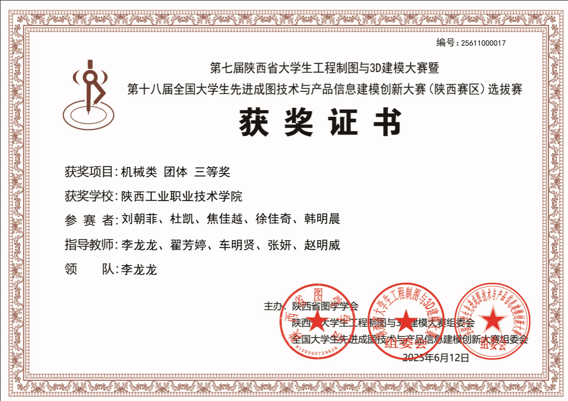 值得一提的是,在此前的陕西省区赛中,我校11名参赛选手已崭露头角,斩获一等奖5项、二等奖2项、三等奖1项并夺得团体三等奖的优异成绩,最终7人凭借优异表现成功晋级国赛。作为图学类课程最高级别国家级赛事,已连续举办18届的成图大赛对选手的绘图技术、空间建模能力及创新思维均有极高要求。我校学子参赛并取得优异成绩,不仅展现了扎实的专业功底与突出的创新实力,更印证了学校在学科建设与人才培养方面的成效。