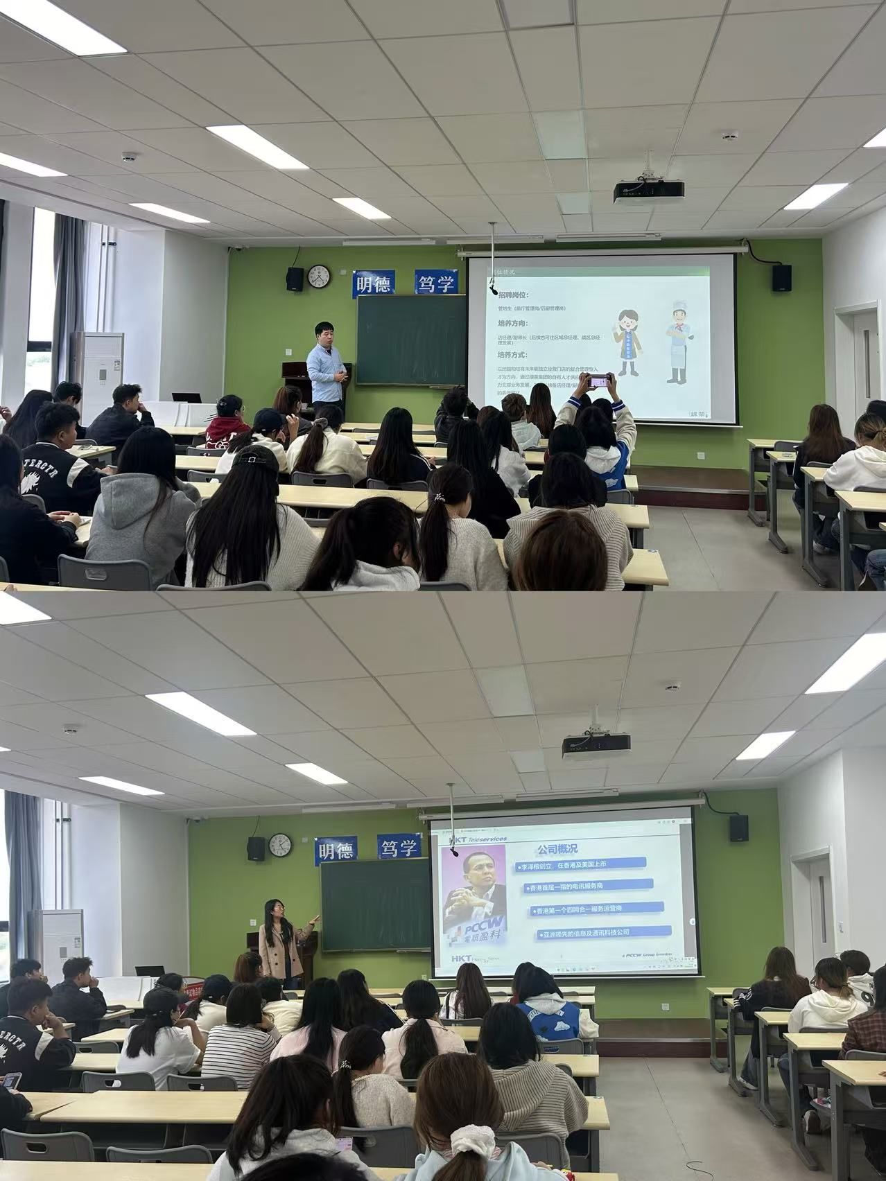 宣讲会伊始,绿茶餐饮集团人力资源总监结合品牌发展历程,介绍了企业全国超300家门店的运营规模,并重点解读了“管培生成长计划”,并为应届生提供6个月轮岗实训,涵盖前厅管理、后厨运营等核心岗位,表现优异者可在1年内晋升门店副理。引发在场学生的关注。随后,电讯盈科人力资源部主管聚焦数字科技领域需求,详解了软件开发、网络维护、客户服务三类岗位的职责与发展路径。作为香港电讯旗下科技巨头,企业展示的5G技术研发项目与完善的岗前培训体系,让学生频频点头。